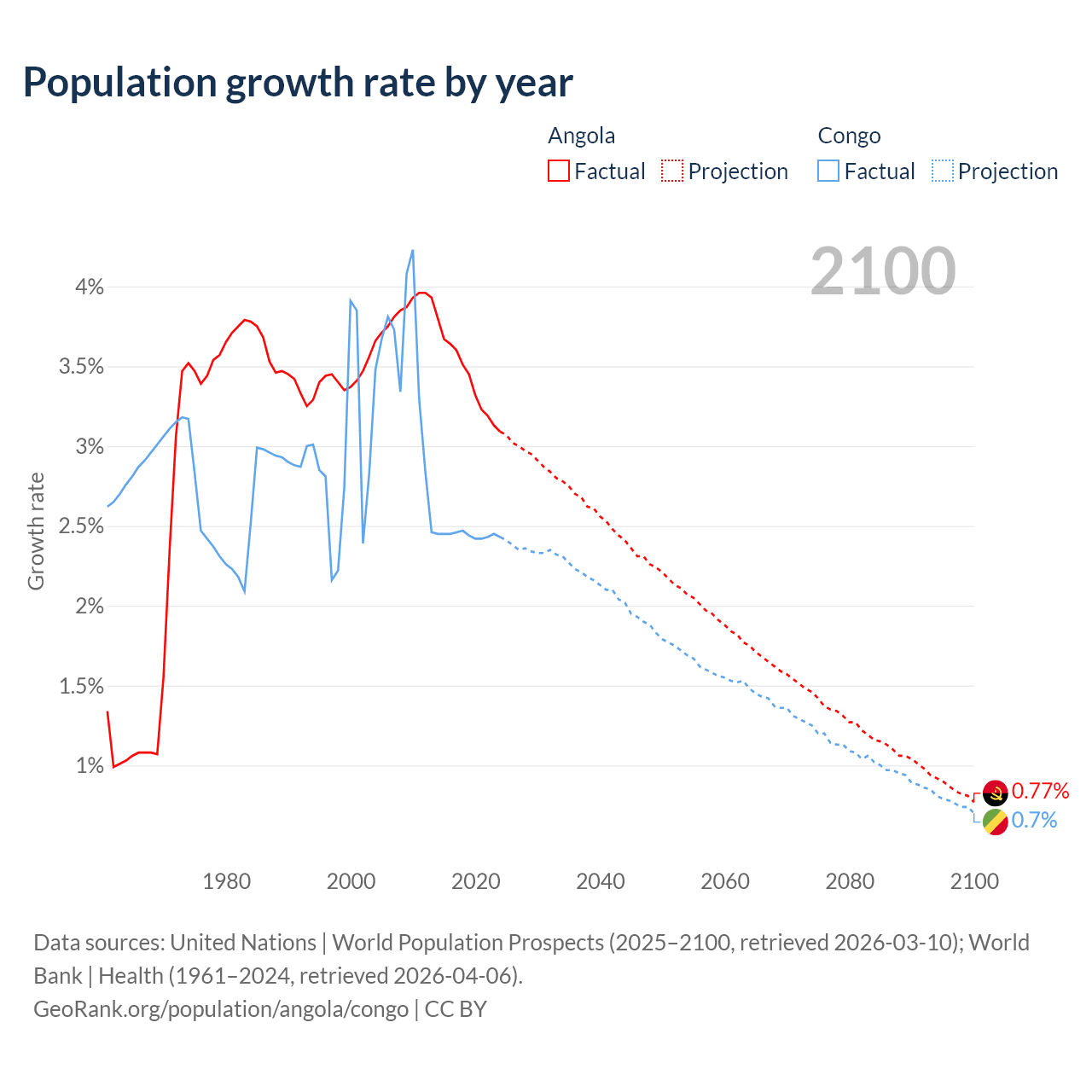- For the last 10 years, Angola has had an average growth rate of +3.42% per year vs +2.44% in the Congo.