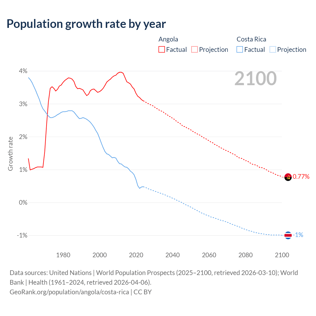- For the last 10 years, Angola has had an average growth rate of +3.42% per year vs +0.77% in Costa Rica.
