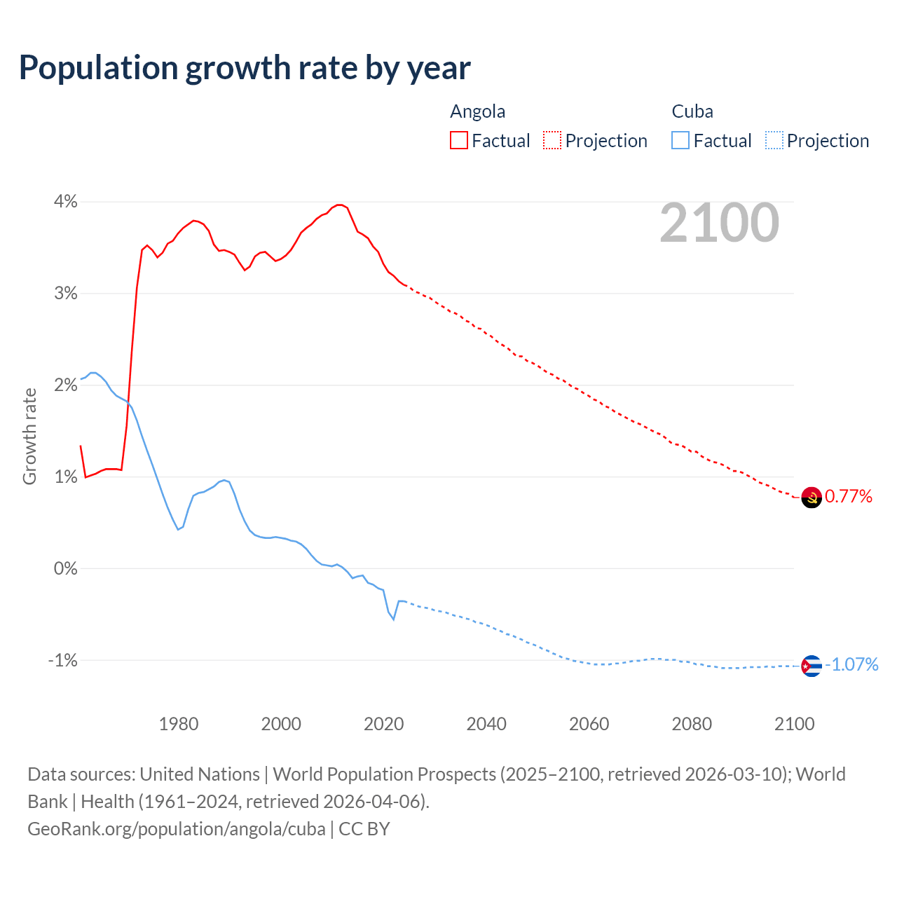 - For the last 10 years, Angola has had an average growth rate of +3.42% per year vs -0.26% in Cuba.
