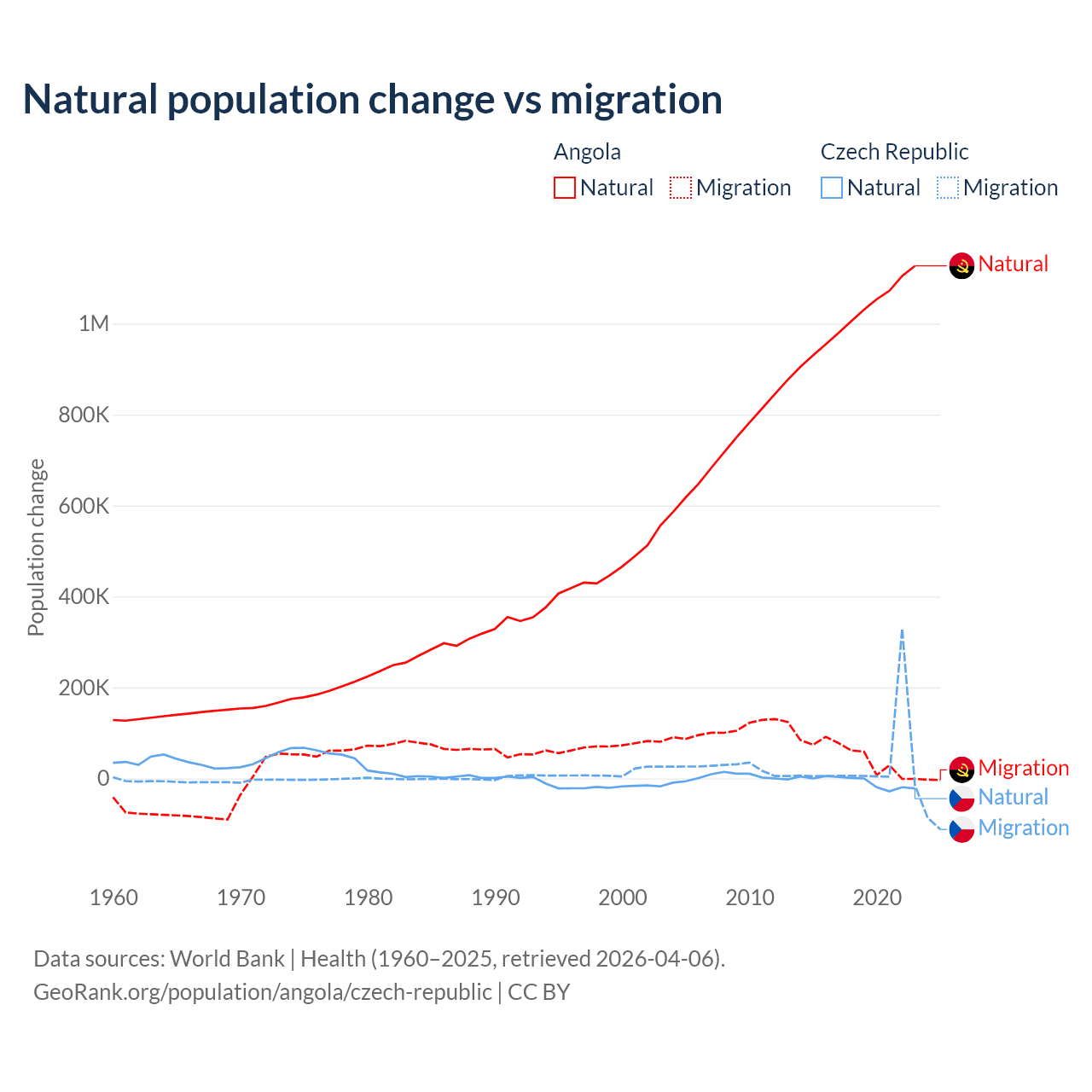 Over the last 10 years, 95.5% of the population change in Angola is from natural causes (a gain of 10,163,567 people) and 4.54% is from migration (a gain of 483,327 people). In the Czech Republic 17.3% is from natural causes (a loss of 74,826 people) and 82.7% is from migration (a gain of 357,502 people).
