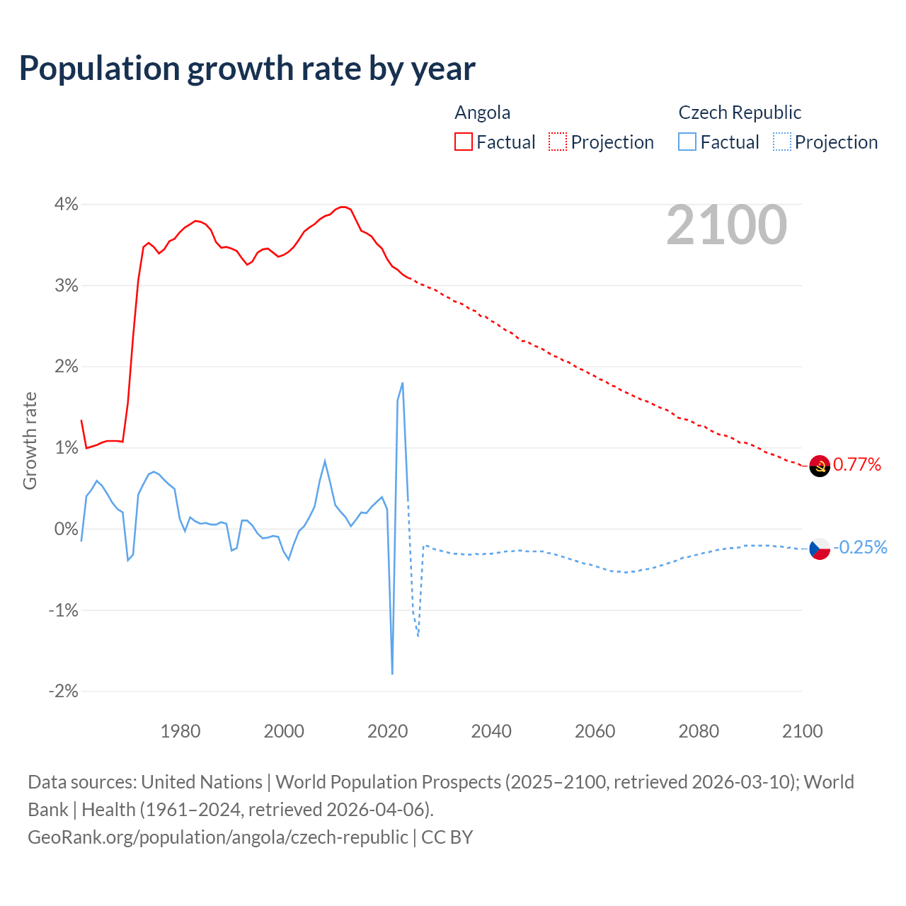 - For the last 10 years, Angola has had an average growth rate of +3.42% per year vs +0.34% in the Czech Republic.