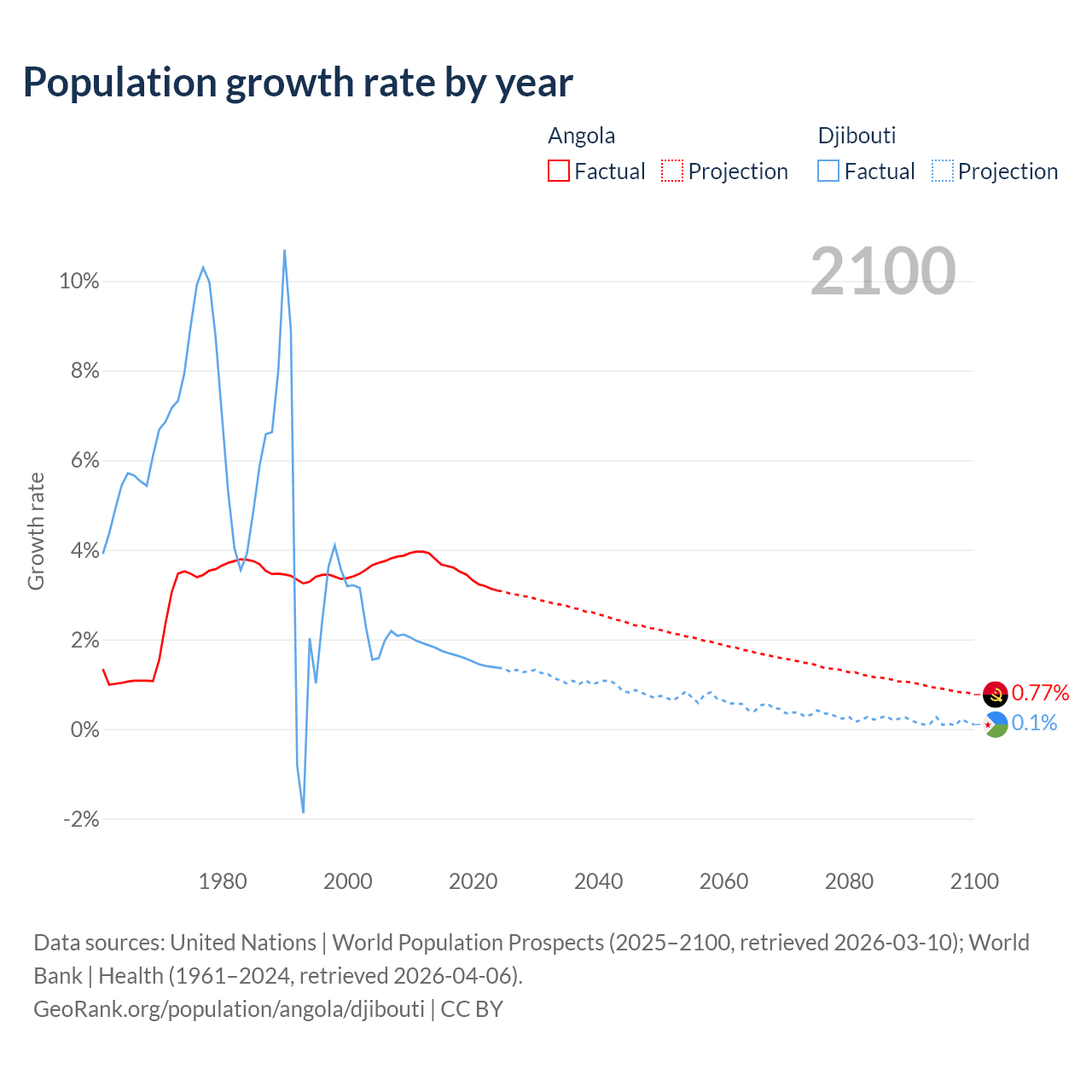 - For the last 10 years, Angola has had an average growth rate of +3.42% per year vs +1.57% in Djibouti.