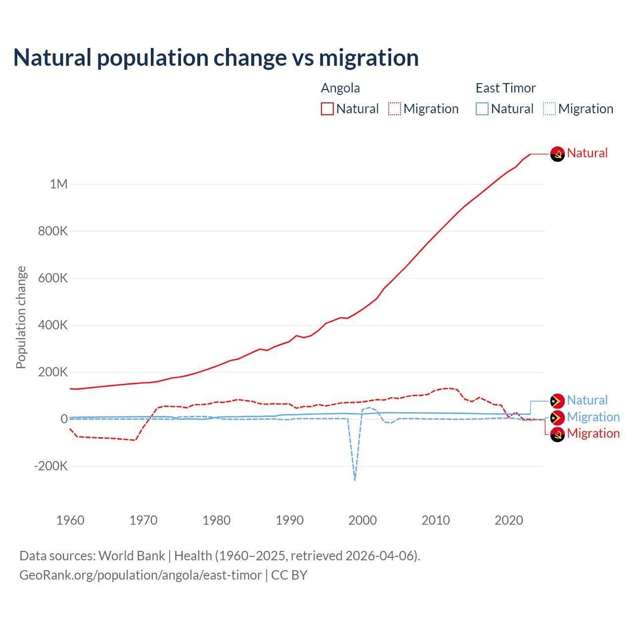 Over the last 10 years, 95.5% of the population change in Angola is from natural causes (a gain of 10,163,567 people) and 4.54% is from migration (a gain of 483,327 people). In East Timor 98.3% is from natural causes (a gain of 217,698 people) and 1.66% is from migration (a gain of 3,665 people).