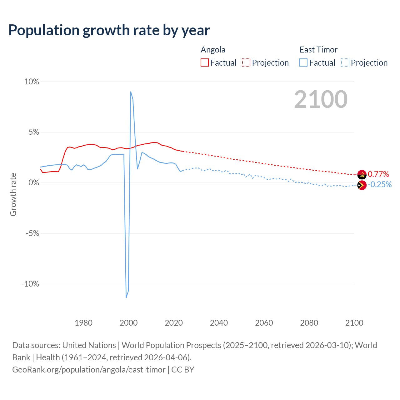 - For the last 10 years, Angola has had an average growth rate of +3.42% per year vs +1.74% in East Timor.
