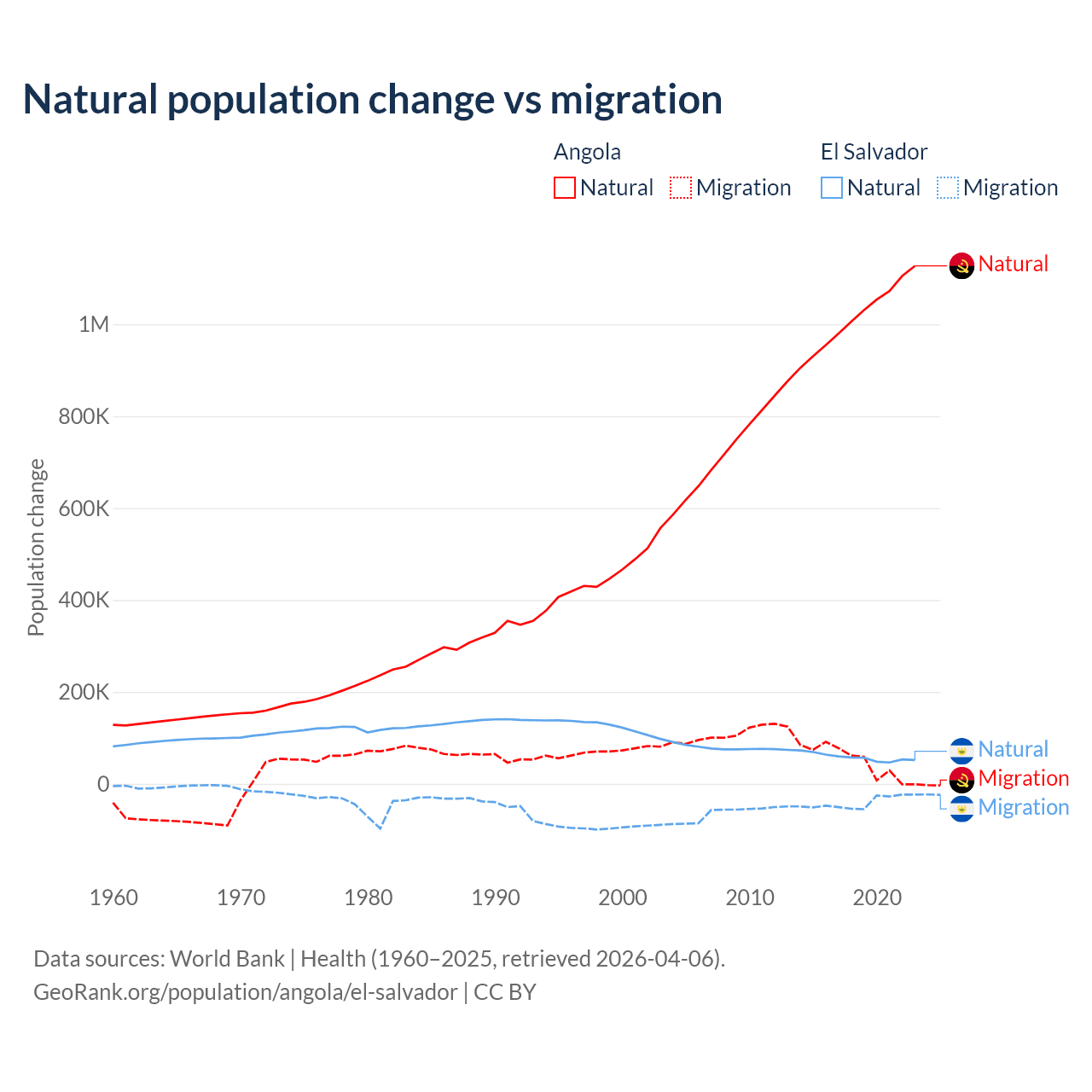 Over the last 10 years, 95.5% of the population change in Angola is from natural causes (a gain of 10,163,567 people) and 4.54% is from migration (a gain of 483,327 people). In El Salvador 58.8% is from natural causes (a gain of 579,641 people) and 41.2% is from migration (a loss of 406,874 people).