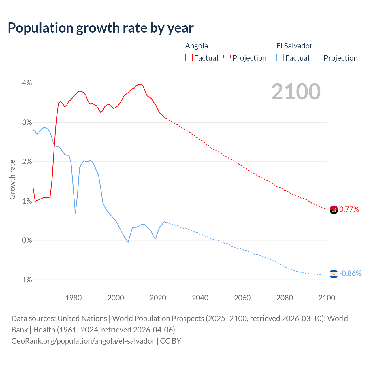 - For the last 10 years, Angola has had an average growth rate of +3.42% per year vs +0.29% in El Salvador.
