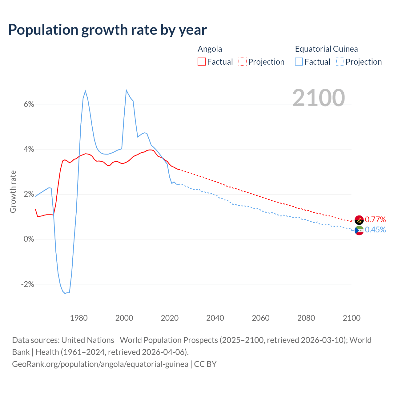 - For the last 10 years, Angola has had an average growth rate of +3.42% per year vs +3.15% in Equatorial Guinea.
