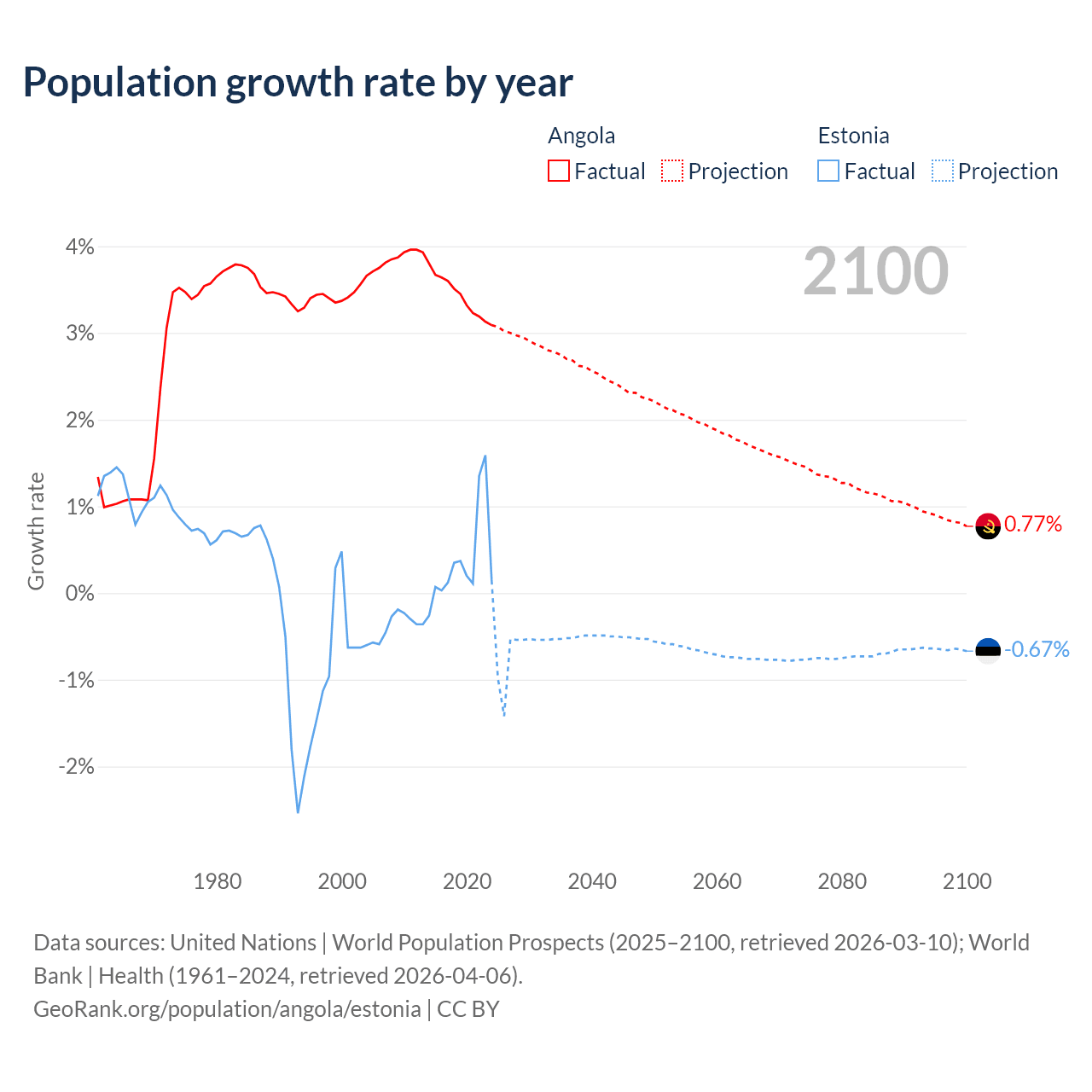 - For the last 10 years, Angola has had an average growth rate of +3.42% per year vs +0.37% in Estonia.