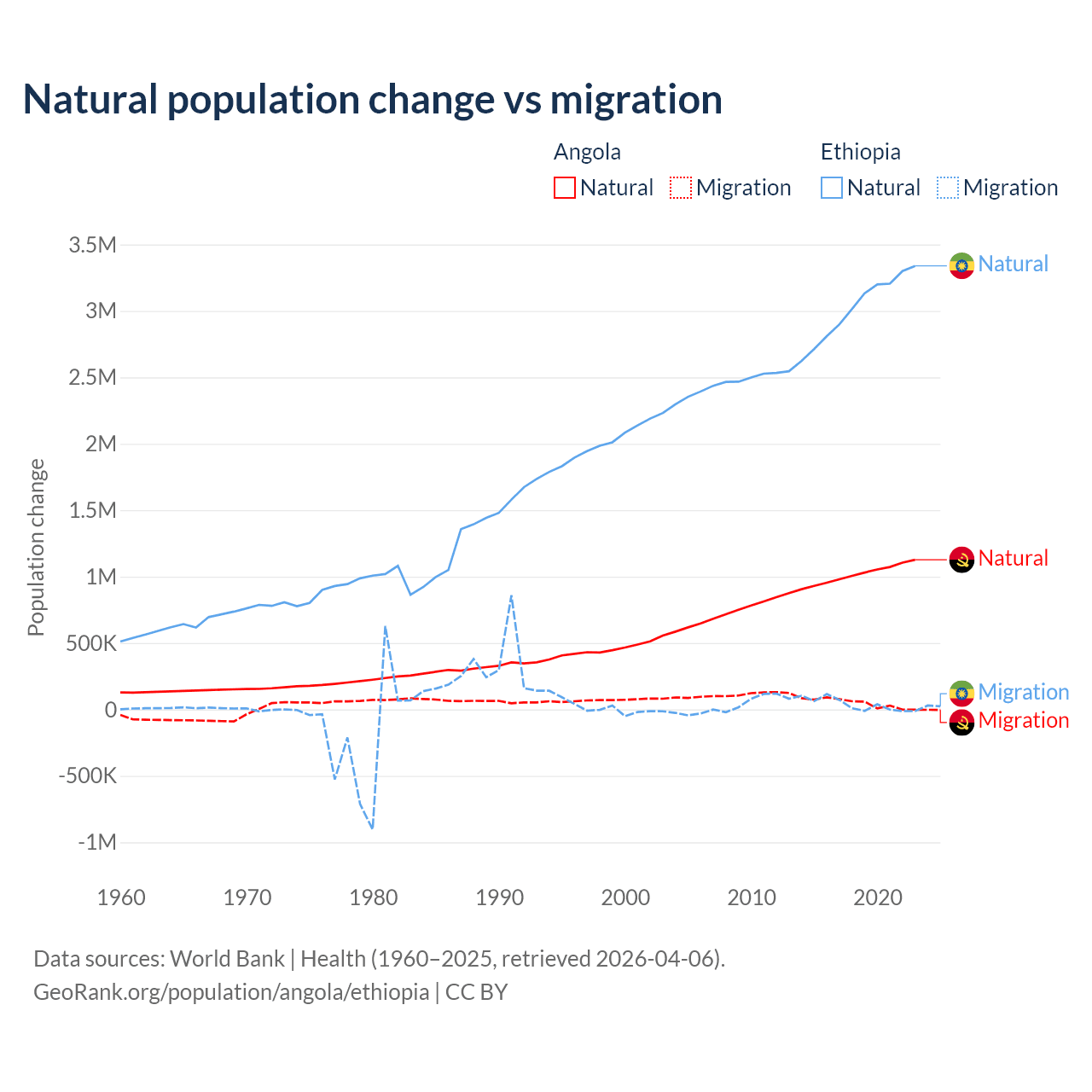 Over the last 10 years, 95.5% of the population change in Angola is from natural causes (a gain of 10,163,567 people) and 4.54% is from migration (a gain of 483,327 people). In Ethiopia 98.8% is from natural causes (a gain of 30,237,373 people) and 1.19% is from migration (a gain of 365,488 people).