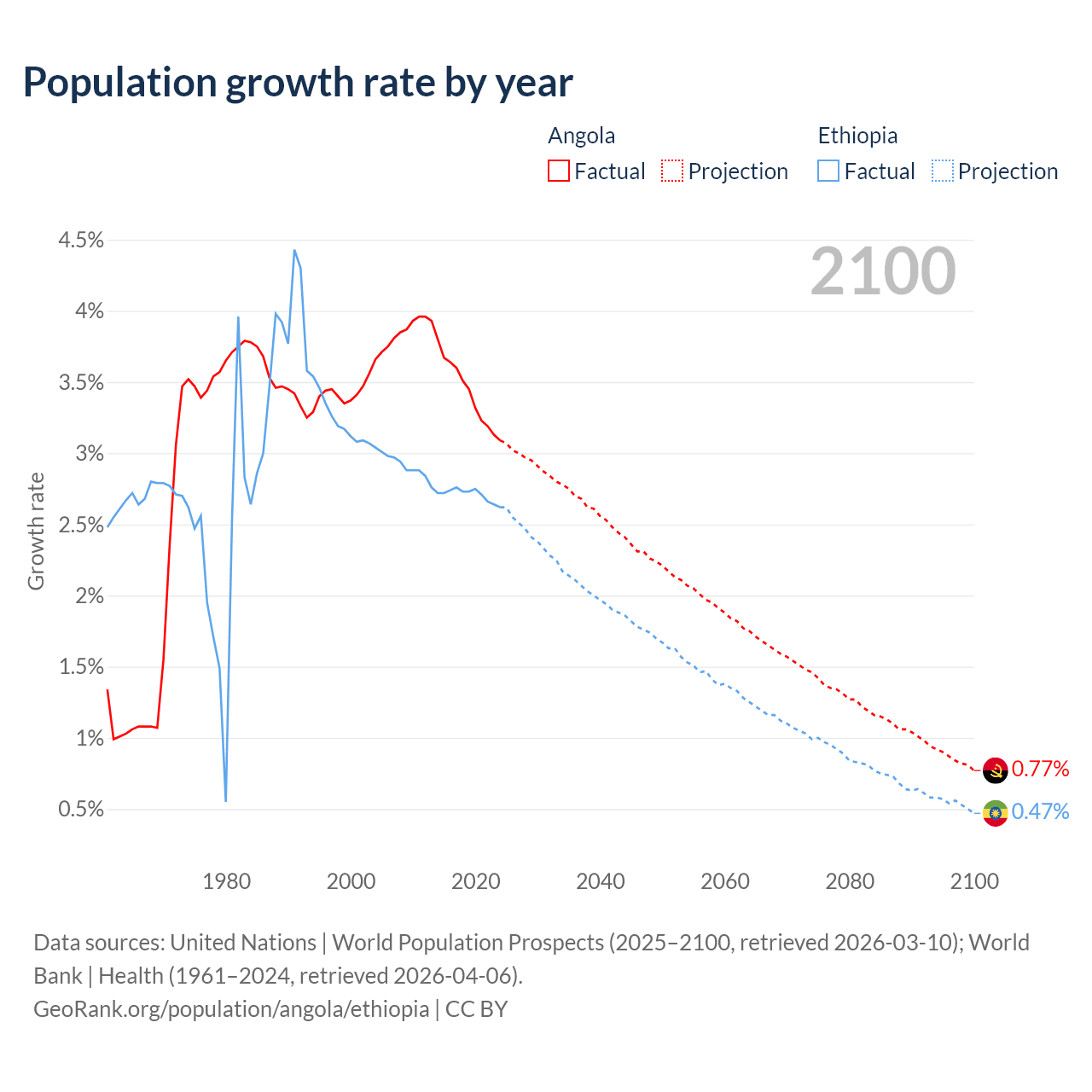 - For the last 10 years, Angola has had an average growth rate of +3.42% per year vs +2.71% in Ethiopia.