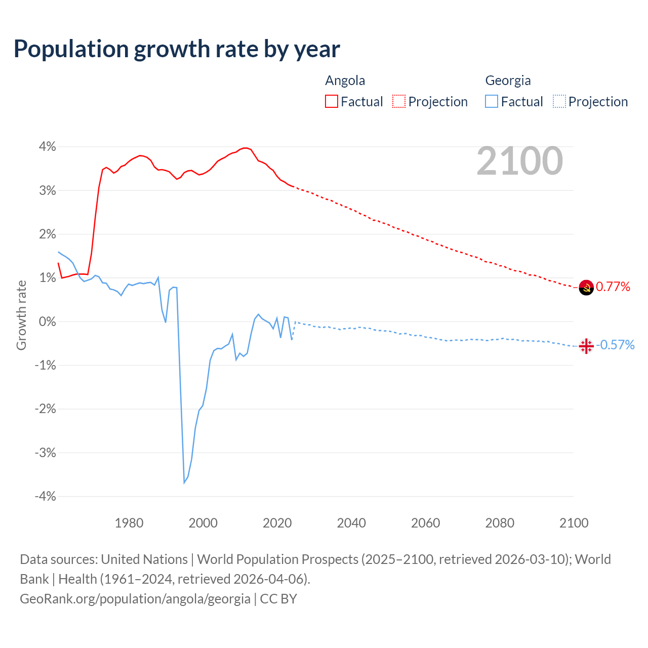 - For the last 10 years, Angola has had an average growth rate of +3.42% per year vs -0.04% in Georgia.