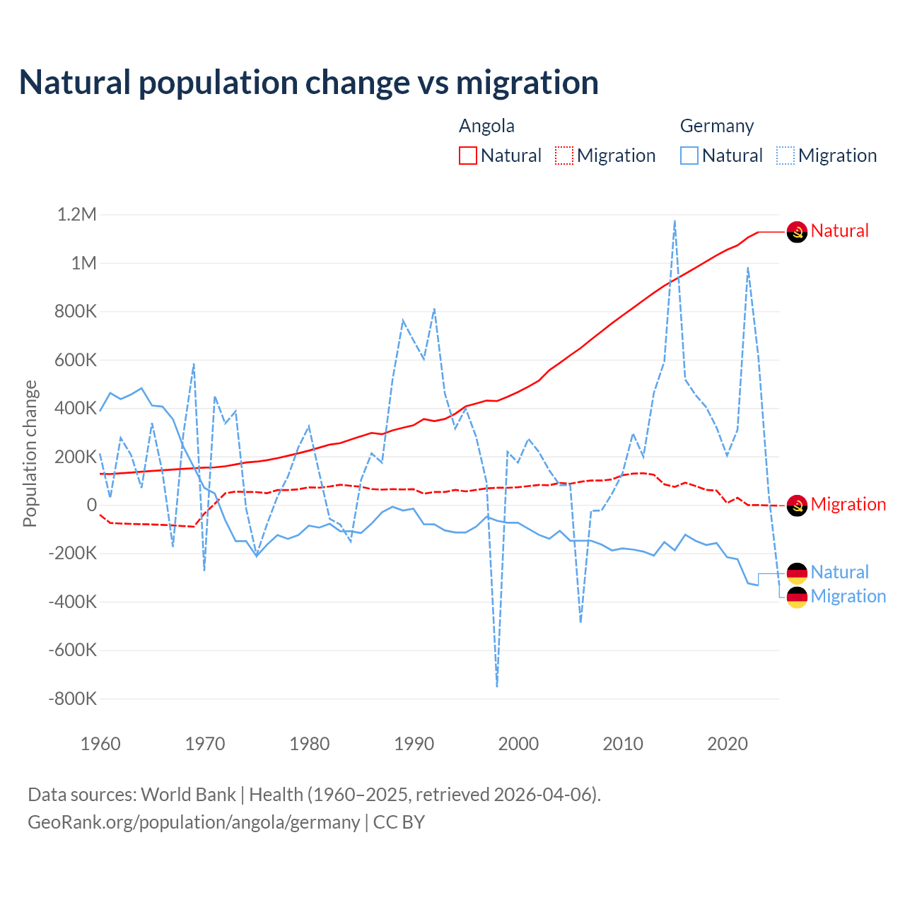 Over the last 10 years, 95.5% of the population change in Angola is from natural causes (a gain of 10,163,567 people) and 4.54% is from migration (a gain of 483,327 people). In Germany 26.8% is from natural causes (a loss of 2,036,130 people) and 73.2% is from migration (a gain of 5,565,916 people).