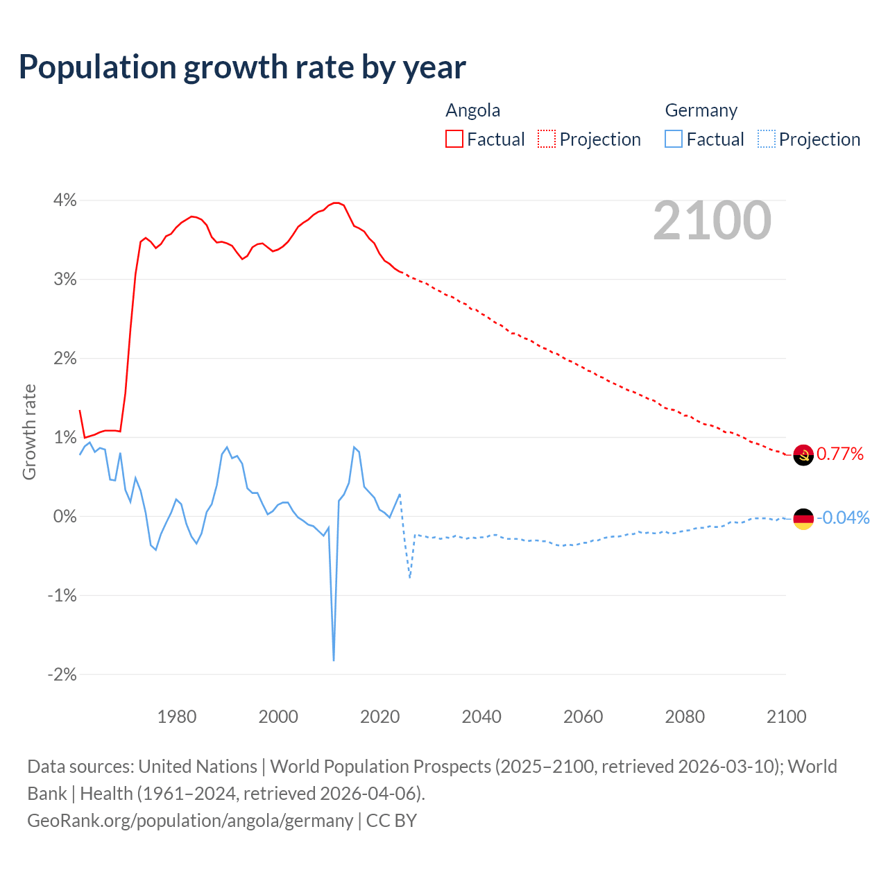 Angola vs Germany: population by year and forecast