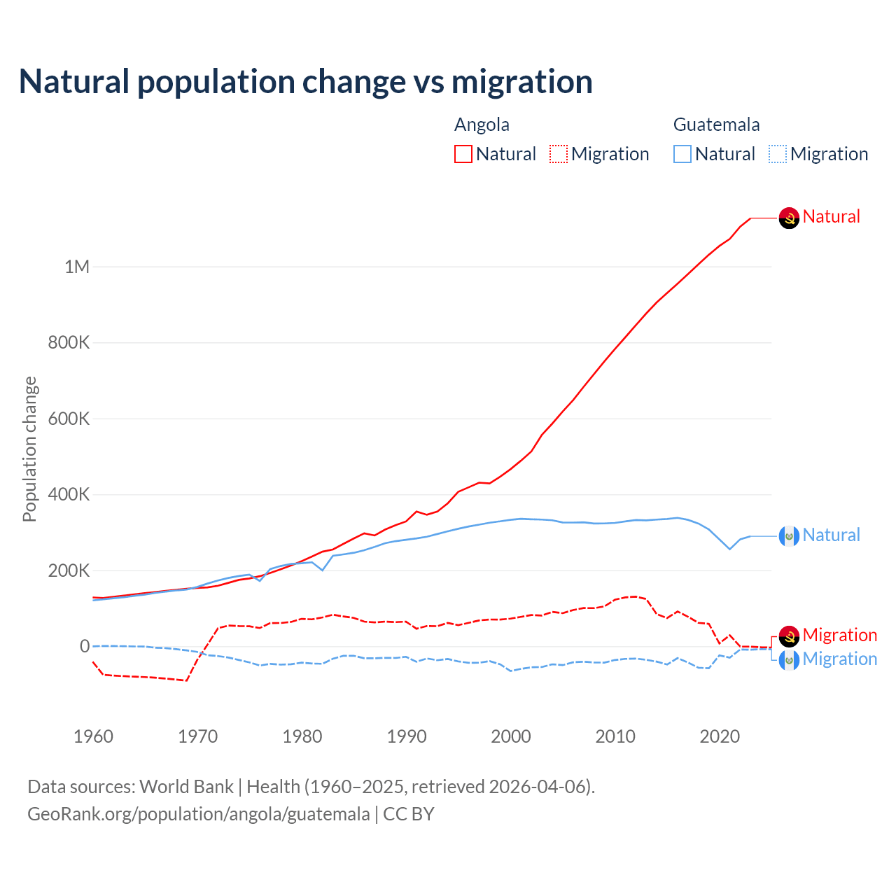 Over the last 10 years, 95.5% of the population change in Angola is from natural causes (a gain of 10,163,567 people) and 4.54% is from migration (a gain of 483,327 people). In Guatemala 89.8% is from natural causes (a gain of 3,077,847 people) and 10.2% is from migration (a loss of 347,818 people).