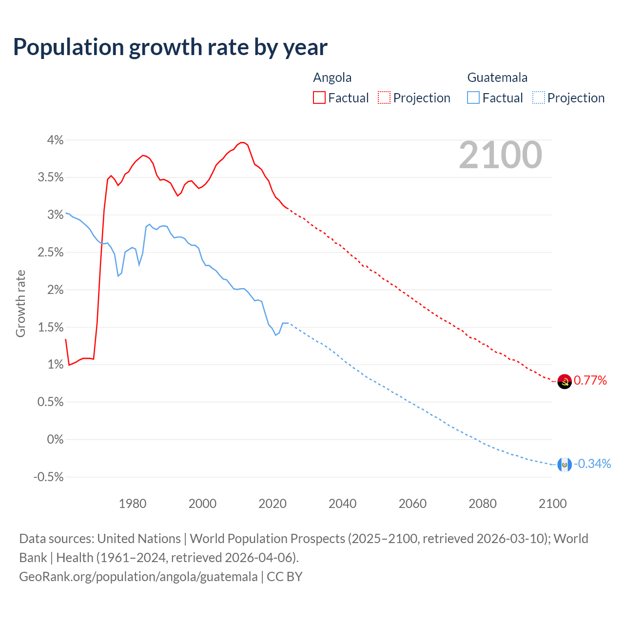 - For the last 10 years, Angola has had an average growth rate of +3.42% per year vs +1.64% in Guatemala.