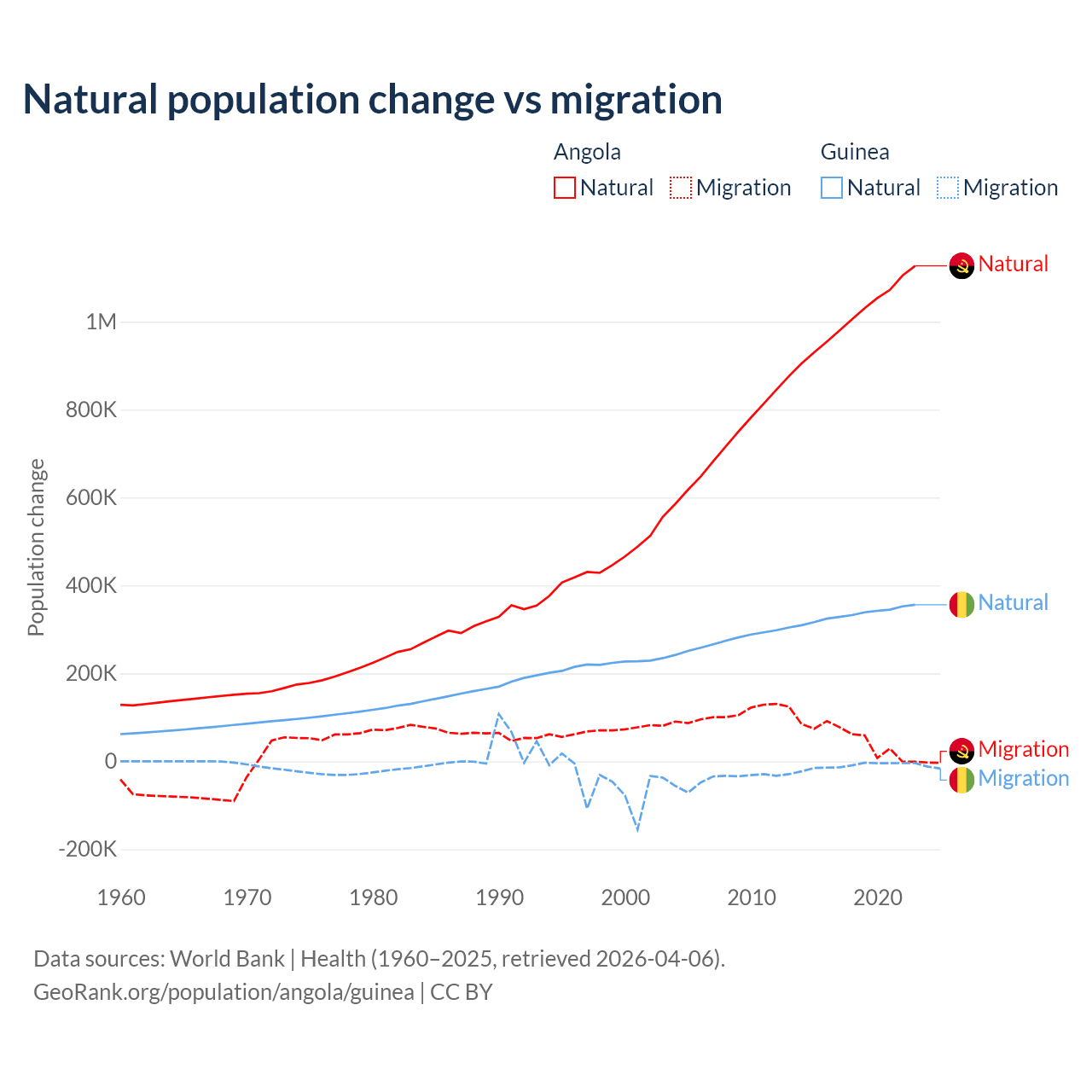 Over the last 10 years, 95.5% of the population change in Angola is from natural causes (a gain of 10,163,567 people) and 4.54% is from migration (a gain of 483,327 people). In Guinea 97.2% is from natural causes (a gain of 3,346,936 people) and 2.76% is from migration (a loss of 94,924 people).