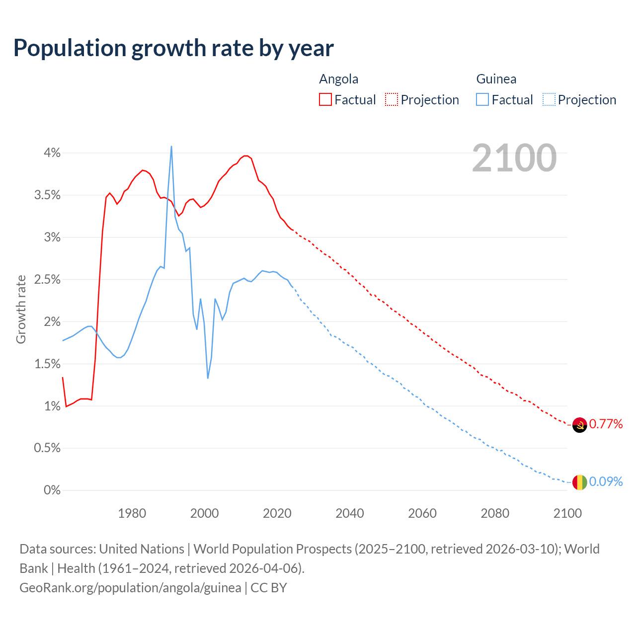 - For the last 10 years, Angola has had an average growth rate of +3.42% per year vs +2.54% in Guinea.