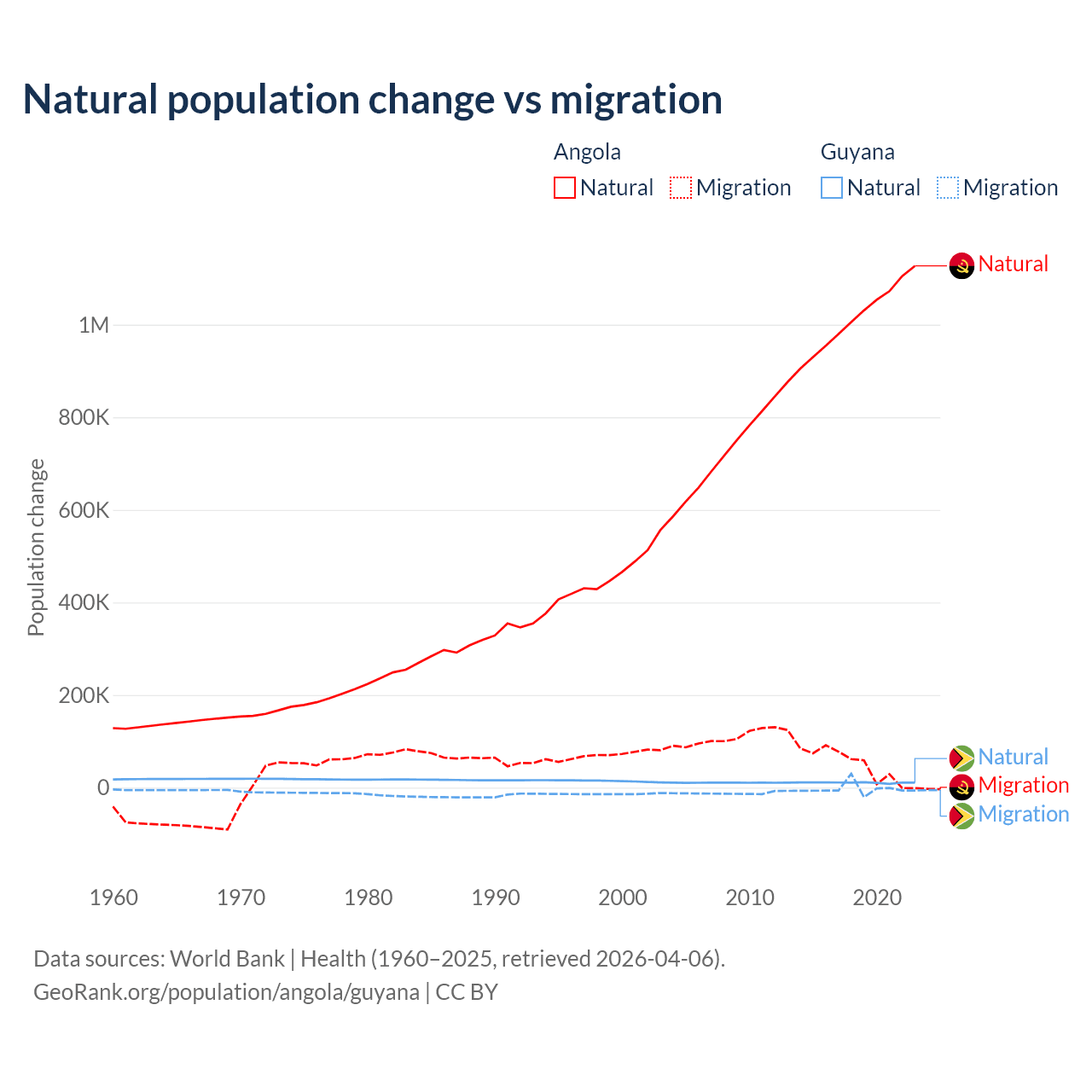 Over the last 10 years, 95.5% of the population change in Angola is from natural causes (a gain of 10,163,567 people) and 4.54% is from migration (a gain of 483,327 people). In Guyana 77.7% is from natural causes (a gain of 107,419 people) and 22.3% is from migration (a loss of 30,797 people).