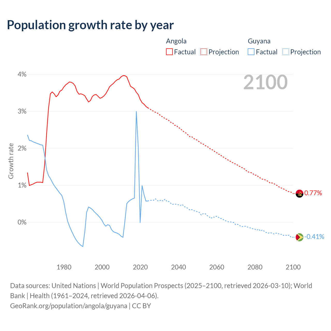 - For the last 10 years, Angola has had an average growth rate of +3.42% per year vs +0.94% in Guyana.