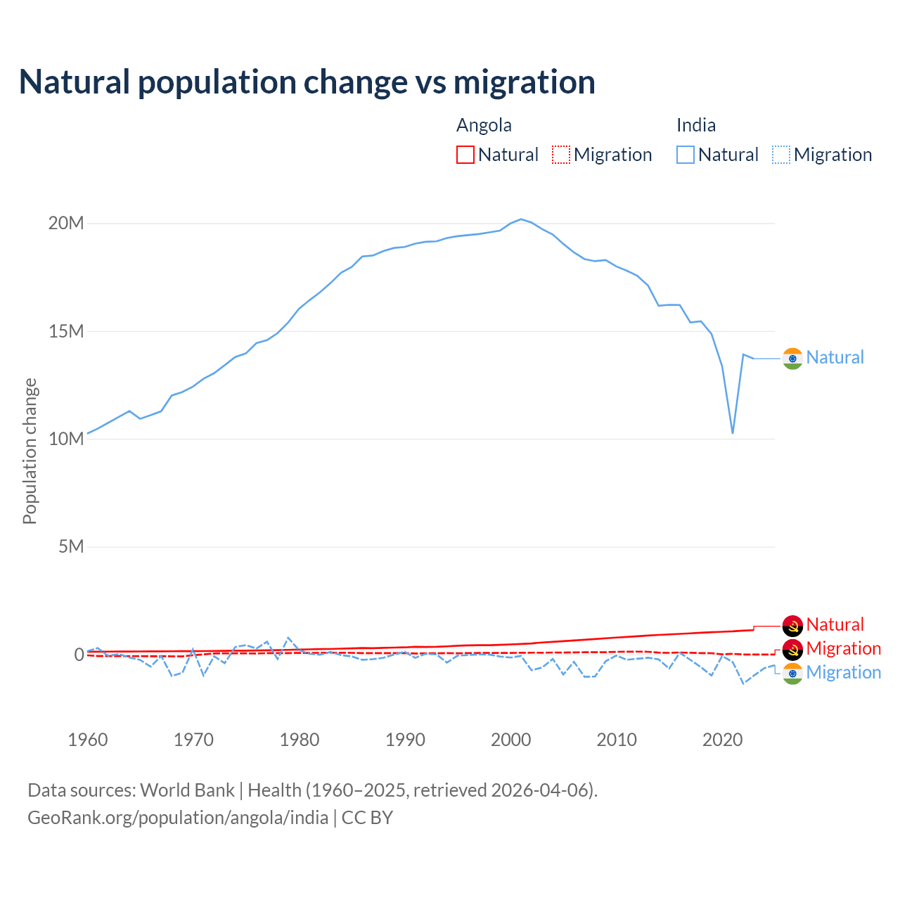 Over the last 10 years, 95.5% of the population change in Angola is from natural causes (a gain of 10,163,567 people) and 4.54% is from migration (a gain of 483,327 people). In India 96.4% is from natural causes (a gain of 145,503,378 people) and 3.56% is from migration (a loss of 5,376,884 people).