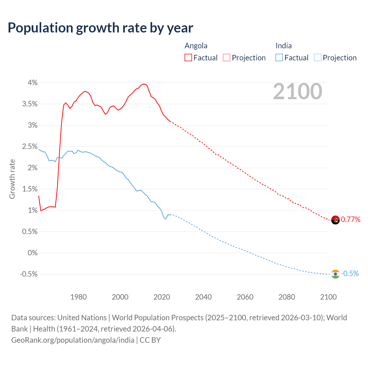 - For the last 10 years, Angola has had an average growth rate of +3.42% per year vs +1.03% in India.