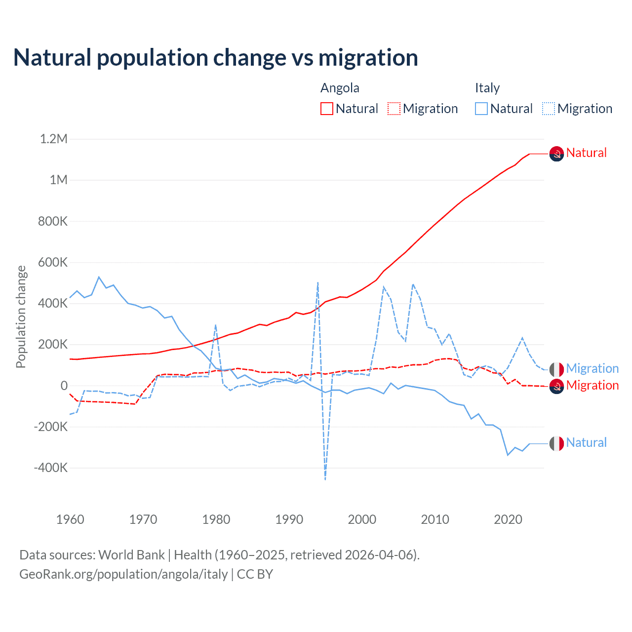 Over the last 10 years, 95.5% of the population change in Angola is from natural causes (a gain of 10,163,567 people) and 4.54% is from migration (a gain of 483,327 people). In Italy 68.6% is from natural causes (a loss of 2,239,084 people) and 31.4% is from migration (a gain of 1,026,128 people).