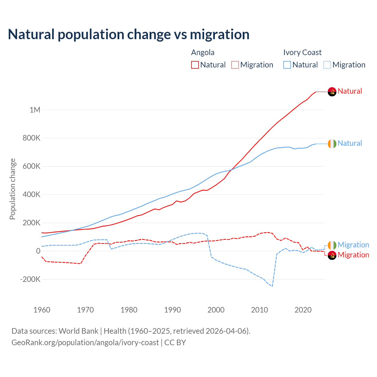 Over the last 10 years, 95.5% of the population change in Angola is from natural causes (a gain of 10,163,567 people) and 4.54% is from migration (a gain of 483,327 people). In Ivory Coast 99.7% is from natural causes (a gain of 7,348,944 people) and 0.33% is from migration (a gain of 24,432 people).