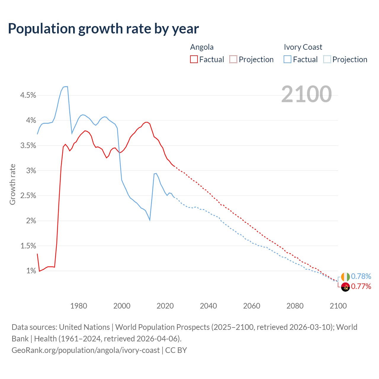- For the last 10 years, Angola has had an average growth rate of +3.42% per year vs +2.65% in Ivory Coast.