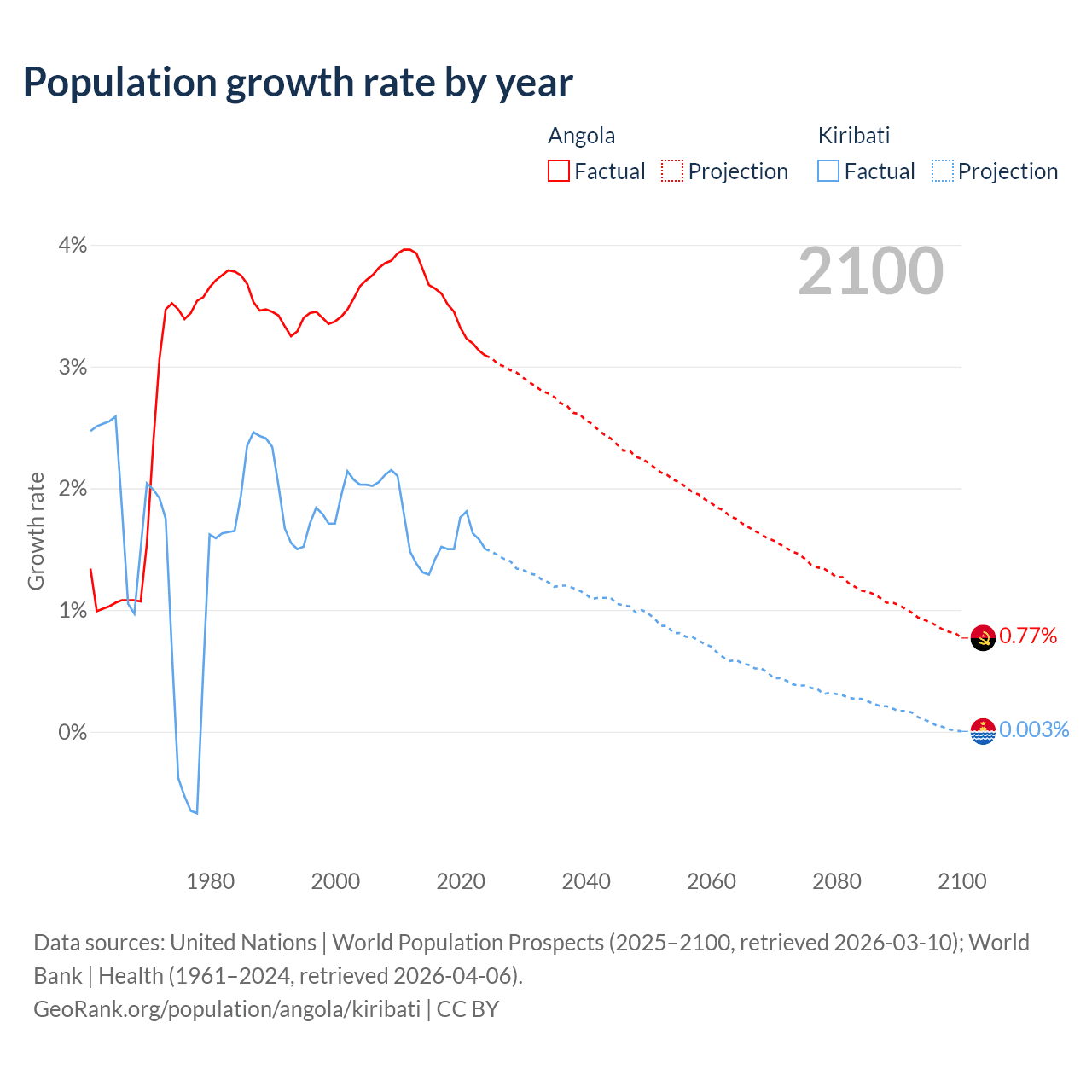 Angola vs Kiribati: population by year and forecast