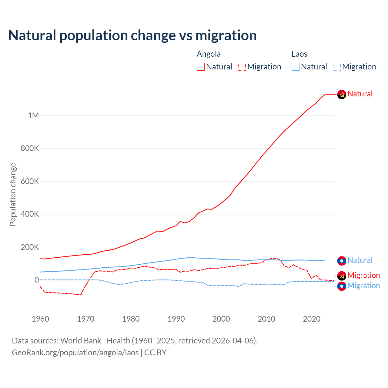 Over the last 10 years, 95.5% of the population change in Angola is from natural causes (a gain of 10,163,567 people) and 4.54% is from migration (a gain of 483,327 people). In Laos 90.6% is from natural causes (a gain of 1,183,013 people) and 9.41% is from migration (a loss of 122,899 people).