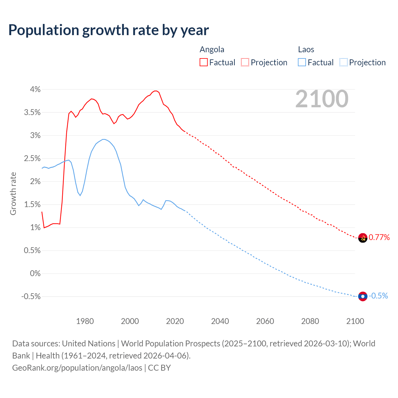 - For the last 10 years, Angola has had an average growth rate of +3.42% per year vs +1.48% in Laos.