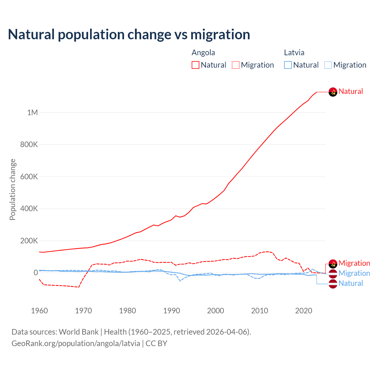 Over the last 10 years, 95.5% of the population change in Angola is from natural causes (a gain of 10,163,567 people) and 4.54% is from migration (a gain of 483,327 people). In Latvia 82.7% is from natural causes (a loss of 103,711 people) and 17.3% is from migration (a loss of 21,641 people).