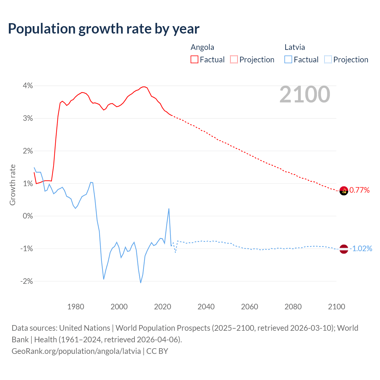 - For the last 10 years, Angola has had an average growth rate of +3.42% per year vs -0.68% in Latvia.