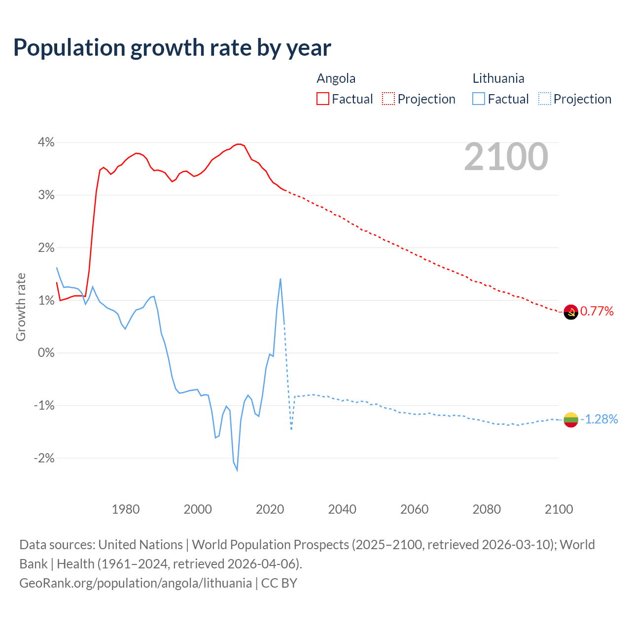 - For the last 10 years, Angola has had an average growth rate of +3.42% per year vs -0.22% in Lithuania.