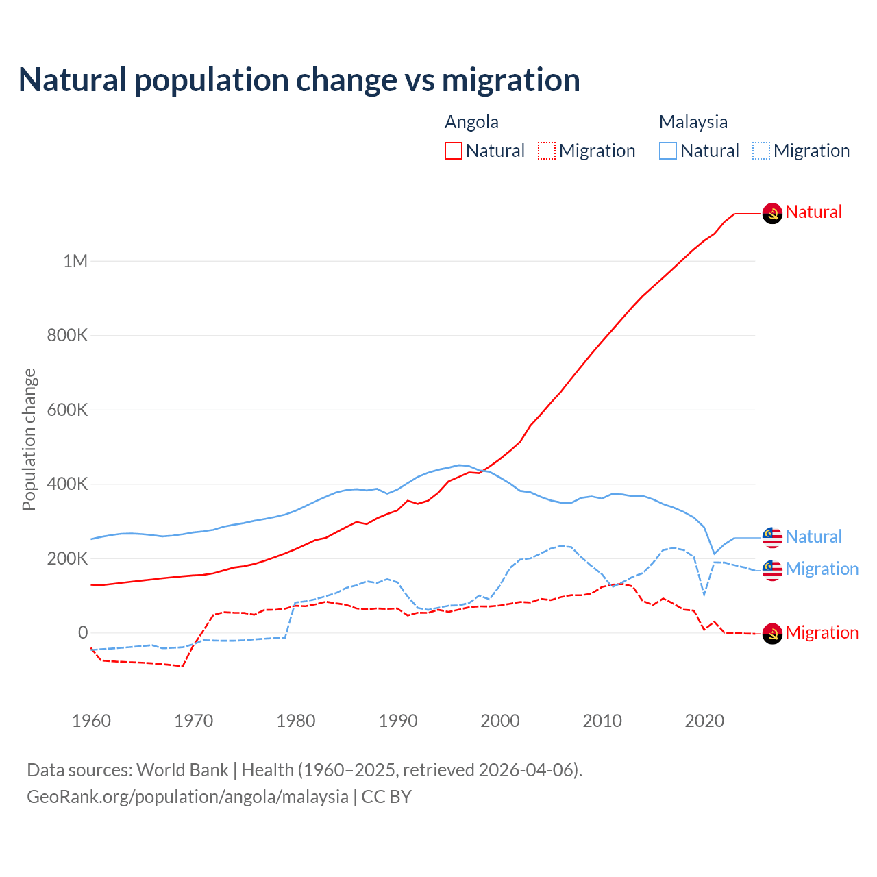 Over the last 10 years, 95.5% of the population change in Angola is from natural causes (a gain of 10,163,567 people) and 4.54% is from migration (a gain of 483,327 people). In Malaysia 61.7% is from natural causes (a gain of 3,029,648 people) and 38.3% is from migration (a gain of 1,882,159 people).