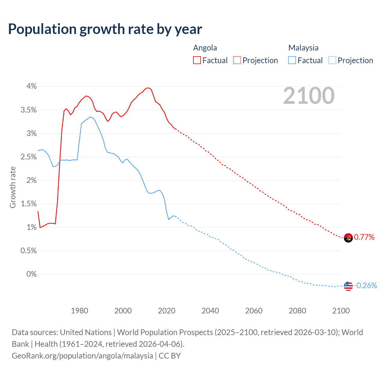 - For the last 10 years, Angola has had an average growth rate of +3.42% per year vs +1.5% in Malaysia.