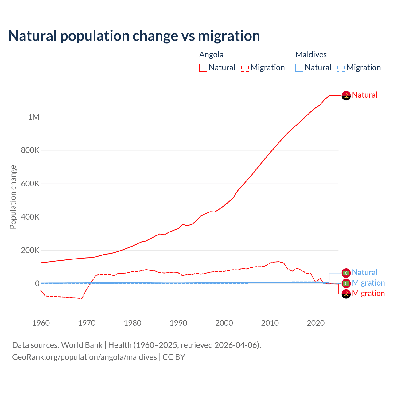 Over the last 10 years, 95.5% of the population change in Angola is from natural causes (a gain of 10,163,567 people) and 4.54% is from migration (a gain of 483,327 people). In Maldives 42.7% is from natural causes (a gain of 51,342 people) and 57.3% is from migration (a gain of 68,788 people).