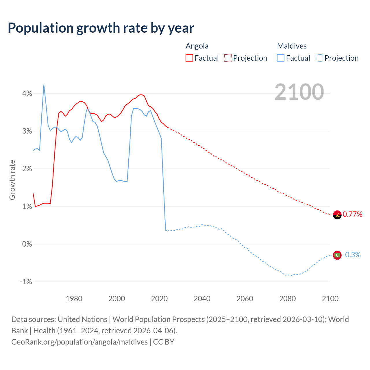 - For the last 10 years, Angola has had an average growth rate of +3.42% per year vs +2.56% in Maldives.