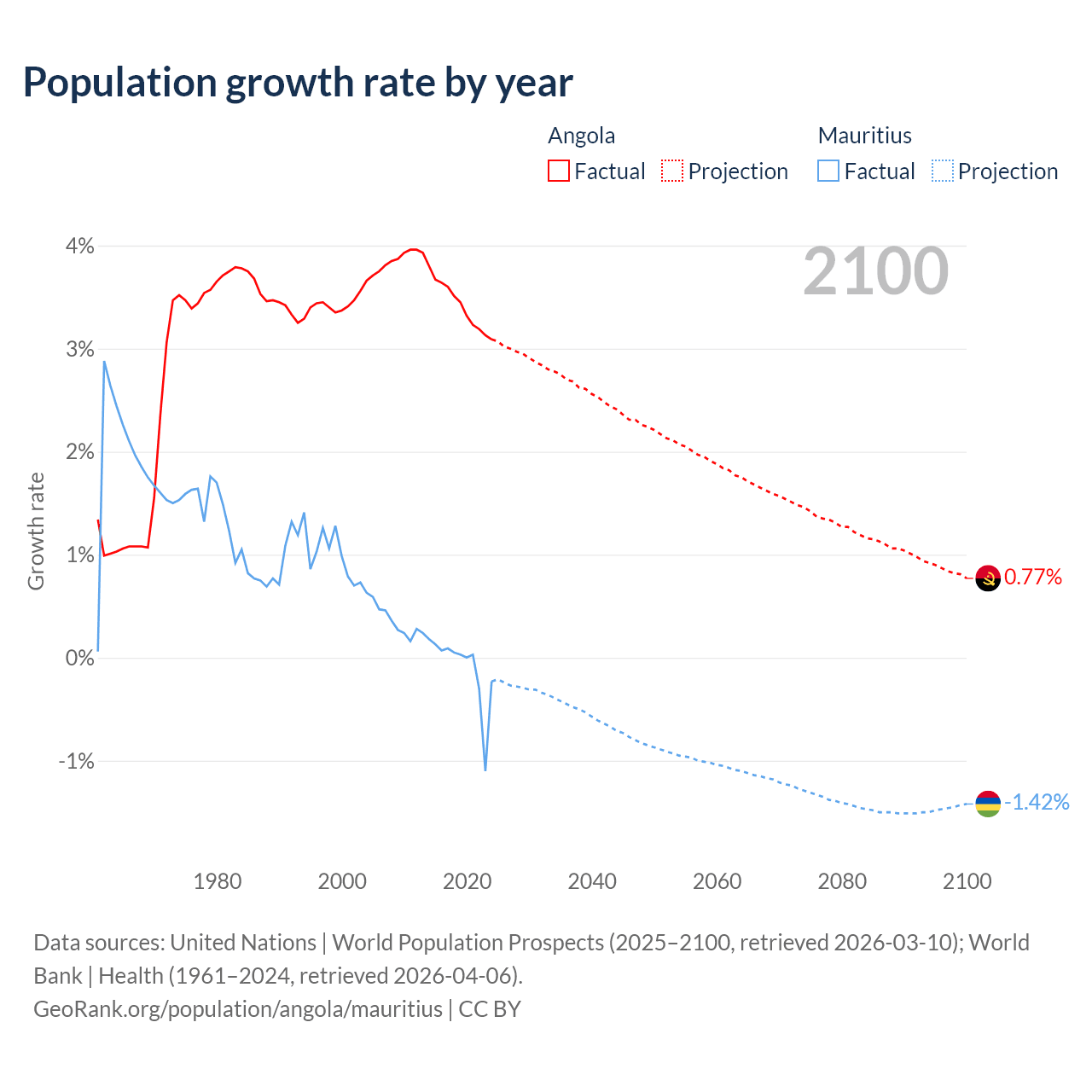 - For the last 10 years, Angola has had an average growth rate of +3.42% per year vs -0.09% in Mauritius.