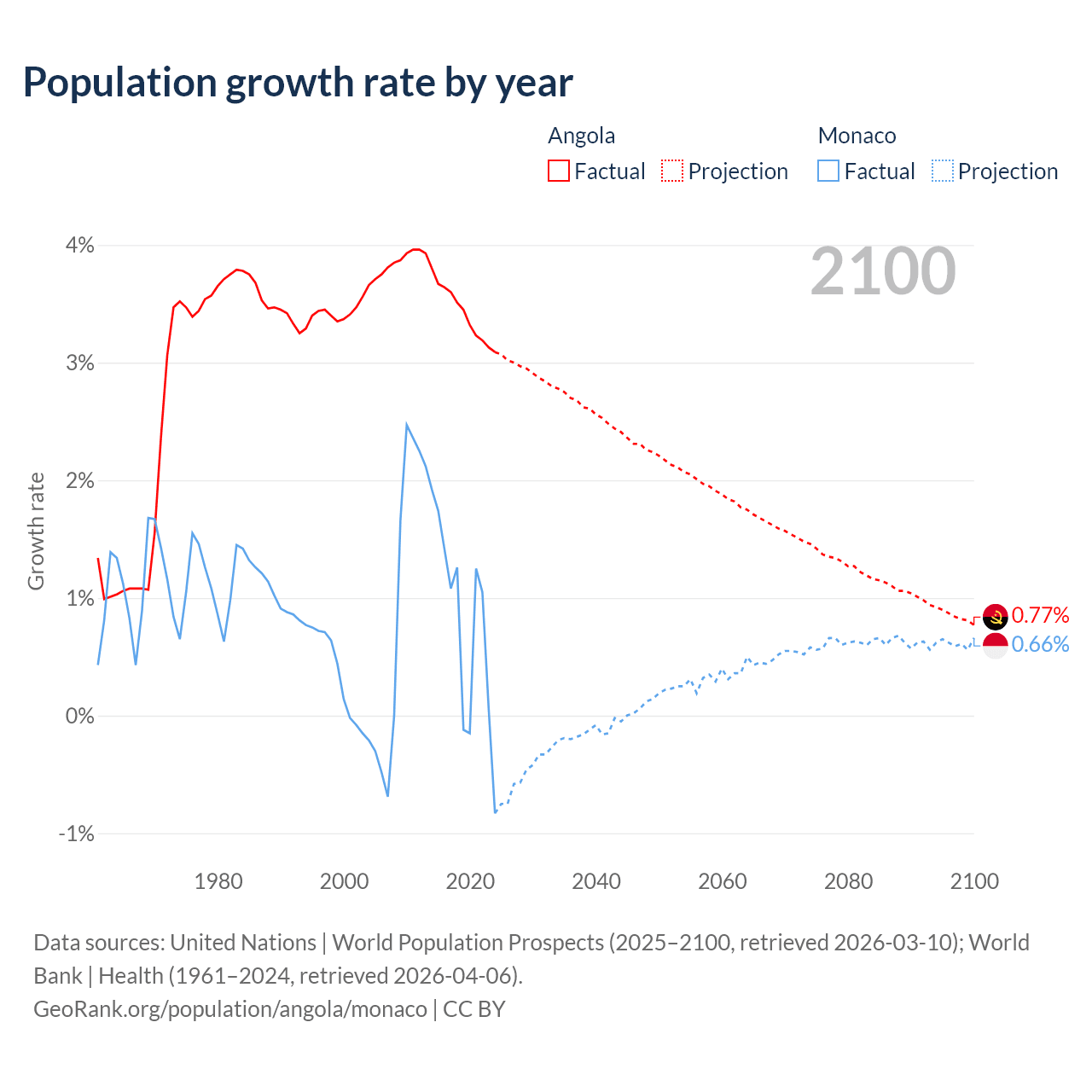 - For the last 10 years, Angola has had an average growth rate of +3.42% per year vs +0.79% in Monaco.