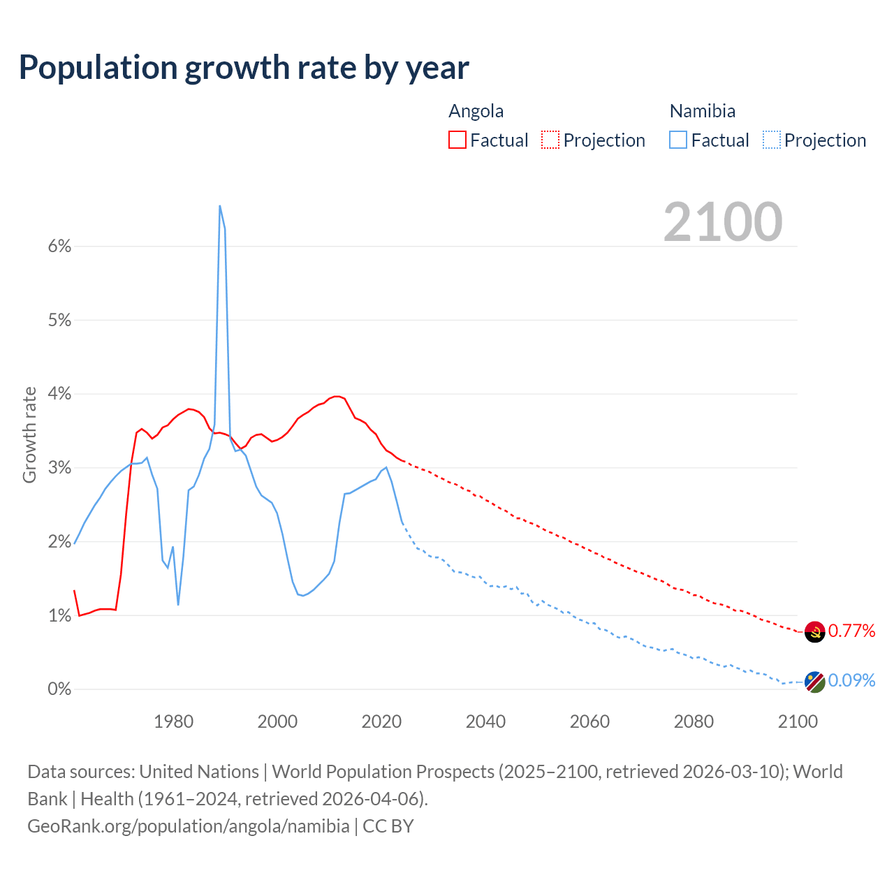 - For the last 10 years, Angola has had an average growth rate of +3.42% per year vs +2.73% in Namibia.