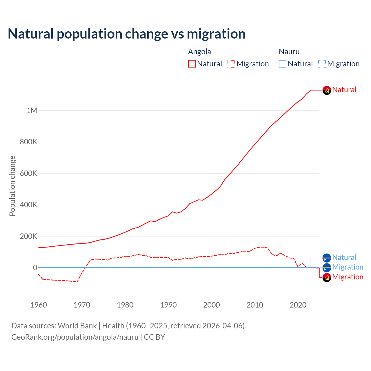 Over the last 10 years, 95.5% of the population change in Angola is from natural causes (a gain of 10,163,567 people) and 4.54% is from migration (a gain of 483,327 people). In Nauru 66.2% is from natural causes (a gain of 2,590 people) and 33.8% is from migration (a loss of 1,320 people).