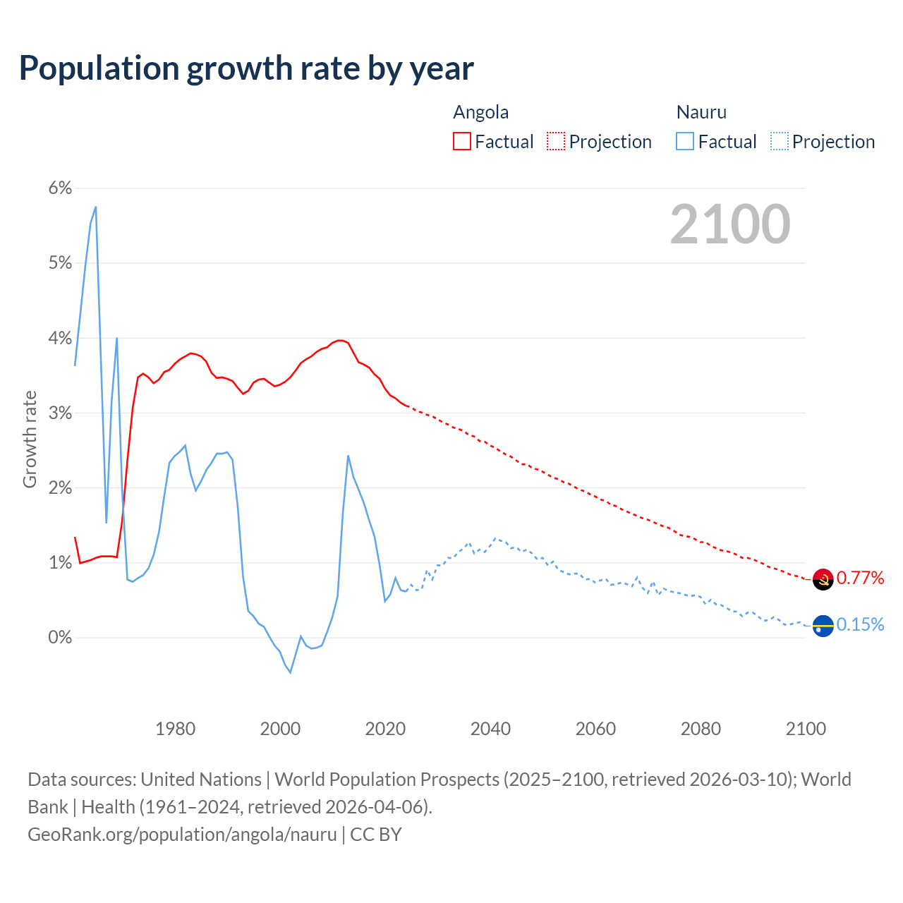- For the last 10 years, Angola has had an average growth rate of +3.42% per year vs +1.17% in Nauru.
