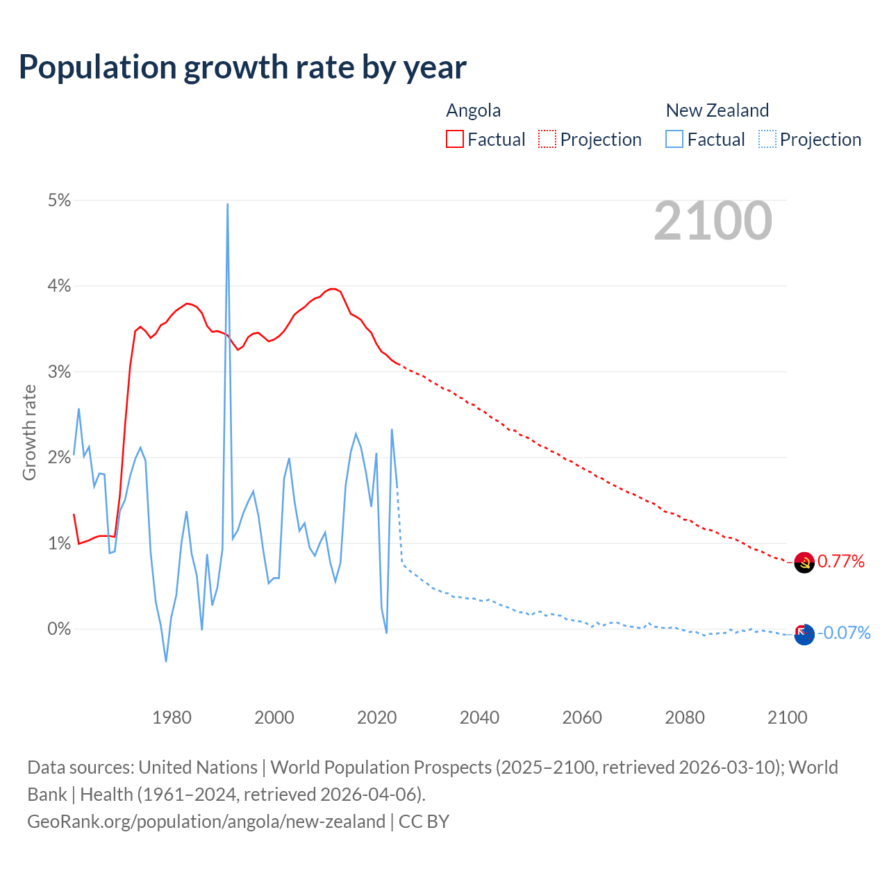 - For the last 10 years, Angola has had an average growth rate of +3.42% per year vs +1.6% in New Zealand.