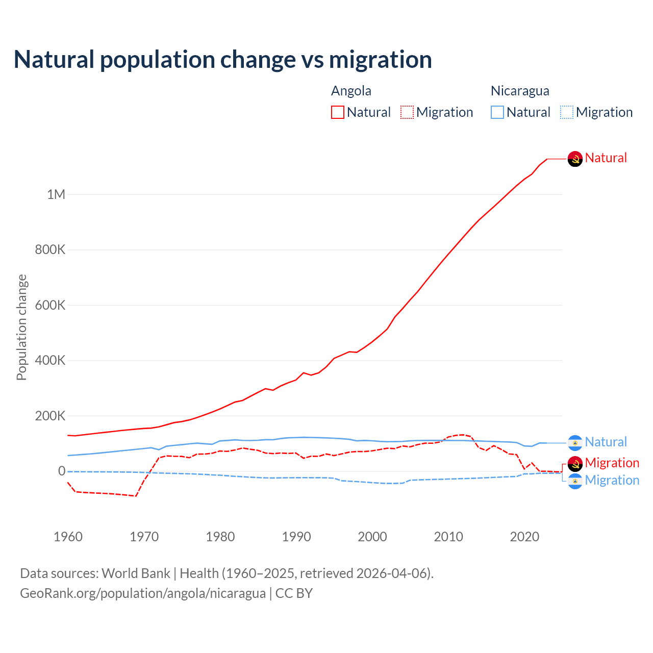 Over the last 10 years, 95.5% of the population change in Angola is from natural causes (a gain of 10,163,567 people) and 4.54% is from migration (a gain of 483,327 people). In Nicaragua 85.5% is from natural causes (a gain of 1,017,084 people) and 14.5% is from migration (a loss of 172,078 people).