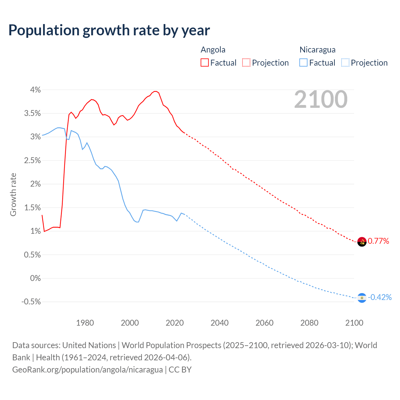- For the last 10 years, Angola has had an average growth rate of +3.42% per year vs +1.33% in Nicaragua.