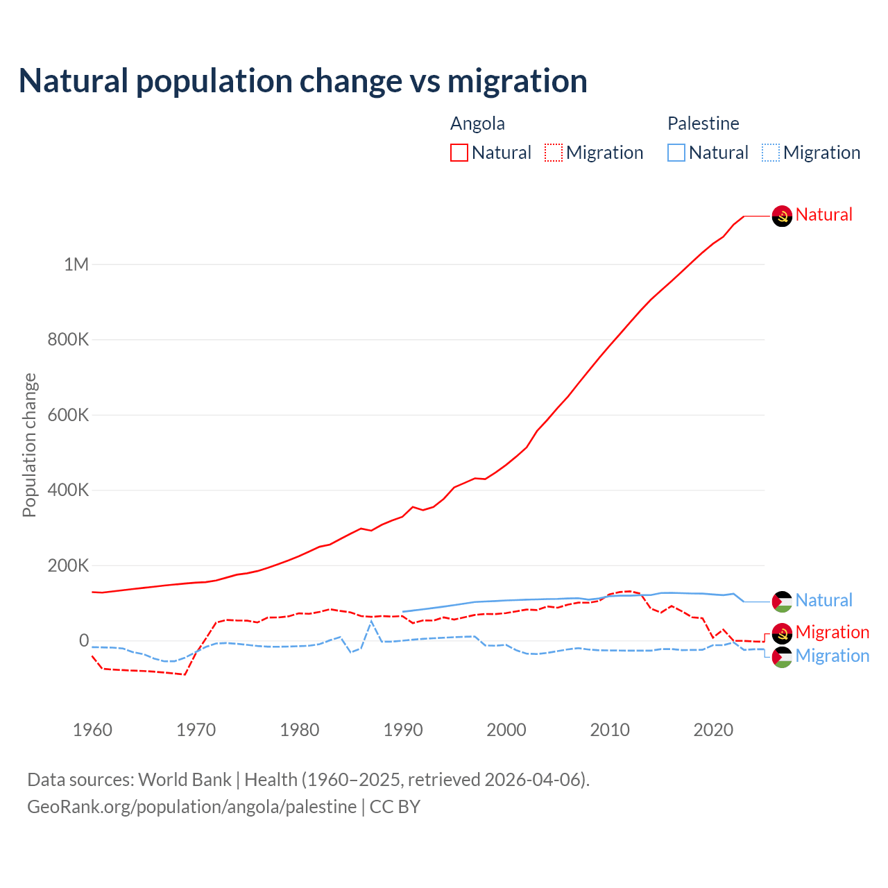 Over the last 10 years, 95.5% of the population change in Angola is from natural causes (a gain of 10,163,567 people) and 4.54% is from migration (a gain of 483,327 people). In Palestine 85.7% is from natural causes (a gain of 1,218,010 people) and 14.3% is from migration (a loss of 202,820 people).
