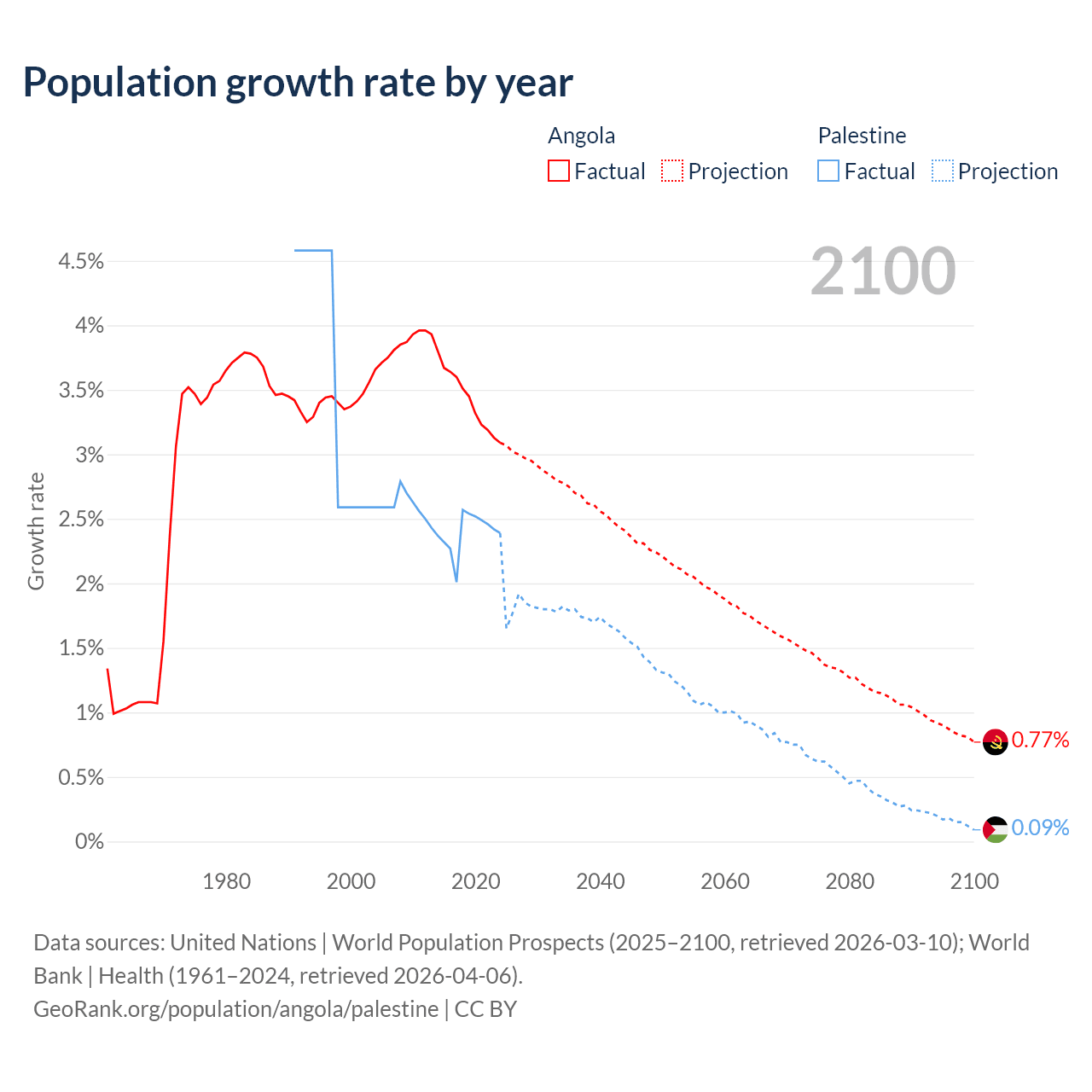 - For the last 10 years, Angola has had an average growth rate of +3.42% per year vs +2.4% in Palestine.