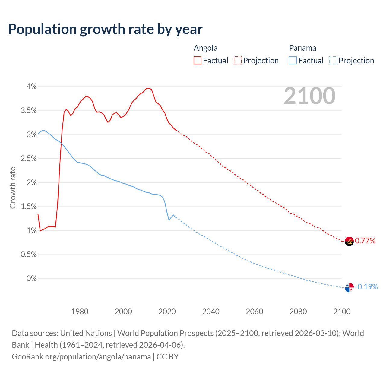 - For the last 10 years, Angola has had an average growth rate of +3.42% per year vs +1.52% in Panama.