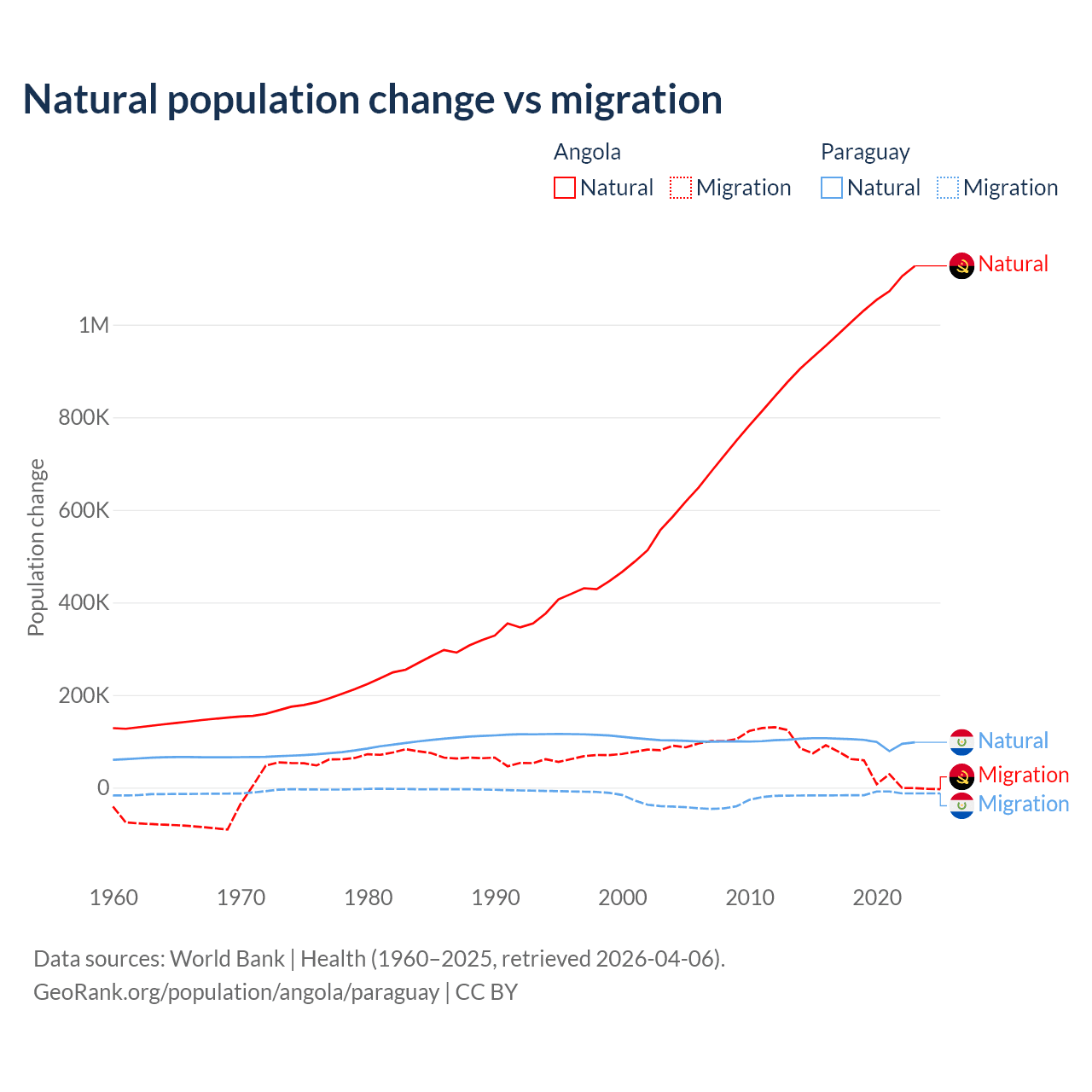 Over the last 10 years, 95.5% of the population change in Angola is from natural causes (a gain of 10,163,567 people) and 4.54% is from migration (a gain of 483,327 people). In Paraguay 87.6% is from natural causes (a gain of 1,002,636 people) and 12.4% is from migration (a loss of 141,377 people).